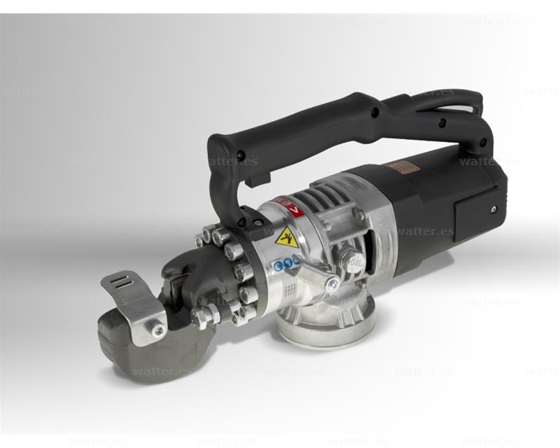 Características técnicas: capacidad de corte: ø 16 mm (Rm: 70 daN/mm²), fuerza de corte: 171 kN (17,4 t), presión de trabajo: 56 Mpa (560 bar), alimentación: principal/batería, motor: 230V: 1100 W - 50Hz - 5,3 A/120V: 1200 W - 60Hz - 10 A, cilindro: simple efecto, peso: 9,5 kg, dimensiones (LxAxA): 415x 122x 225mm..
