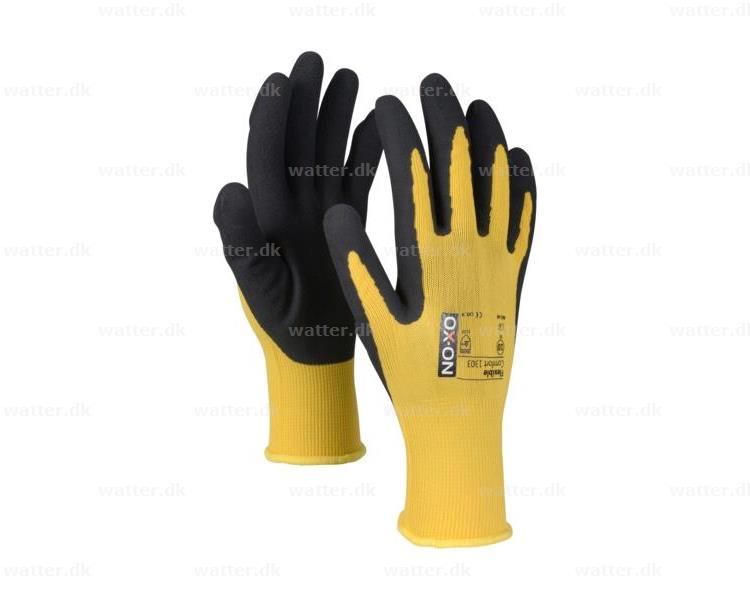 Guante de punto ajustado y cubierto con los dedos. Recubrimiento de espuma de látex en la palma y las yemas de los dedos. 144 piezas