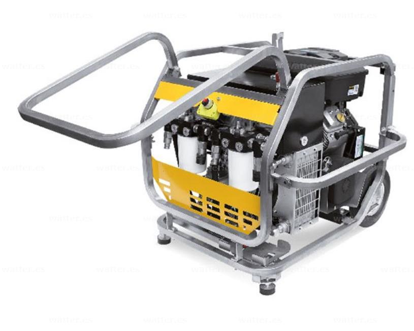 SUPER RAPTOR DUAL es un grupo hidráulico de doble herramienta con motor de gasolina bicilíndrico de 18 CV, con arranque eléctrico de tracción. La máquina dispone de dos opciones de suministro hidráulico: dos circuitos hidráulicos a 19 L/min cada uno o combinados en un único circuito a 38 L/min con una presión máxima de 140 Bar. La aceleración del motor puede ser fija y también automática con pistón según las especificaciones del cliente. La selección del tipo de caudal y aceleración se puede realizar en un momento a través de cómodas asas.